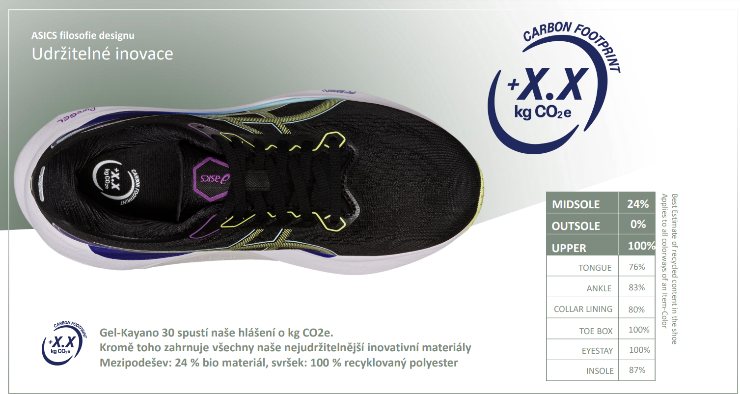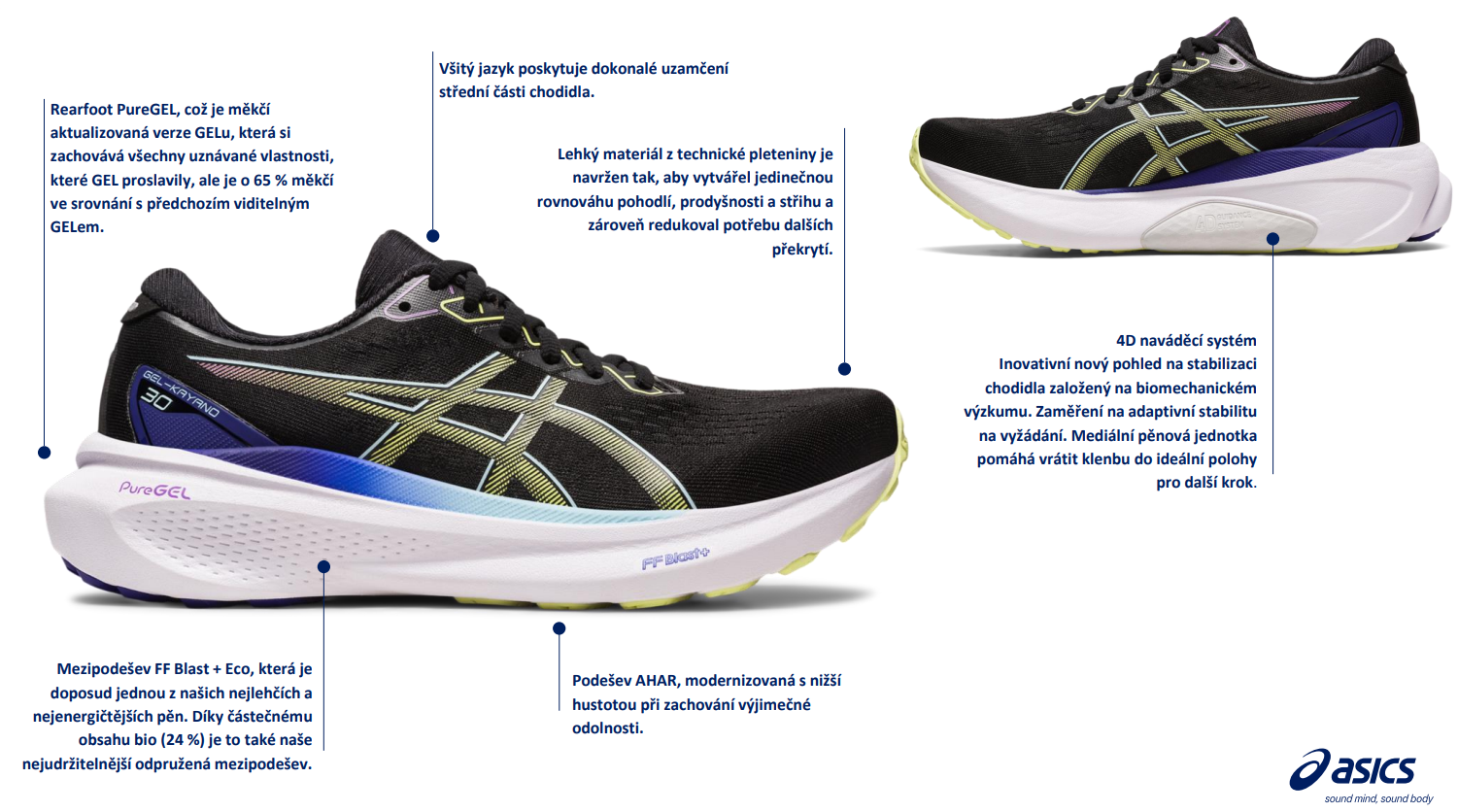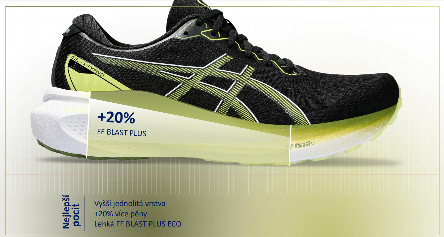 Pouhých 5 km nebo celý maraton, bota GEL-KAYANO™ 30 je navržena tak, aby vašim nohám poskytla pokročilou stabilitu a tlumení pro maximální pohodlí až do cíle. Nový 4D GUIDANCE SYSTEM™ napomáhá k ještě lepší stabilitě. Díky tomu bude váš krok během tréninku vyváženější, s poskytnutím maximální podpory. Mezipodešev je vylepšena o vrstvu FF BLAST™ PLUS ECO tlumení, nyní o 4 mm vyšší. Až 20 % složek použitých na výrobu je vytvořeno na bio bázi. Tento materiál vám zajistí krok měkký a pohodlný jako v bavlnce. Nová PureGEL™ technologie, strategicky umístěná pod patou, se stará o hladší běžecký krok. Navíc se postará až o 65 % měkčí dopad, než je tomu u běžné GEL™ technologie, pro hladký krok a pohodlí i na tu nejdelší vzdálenost.