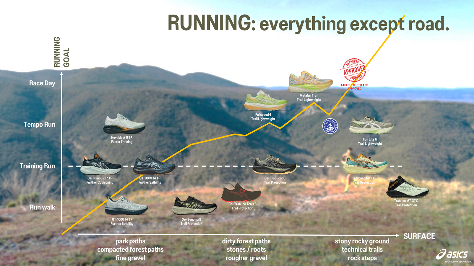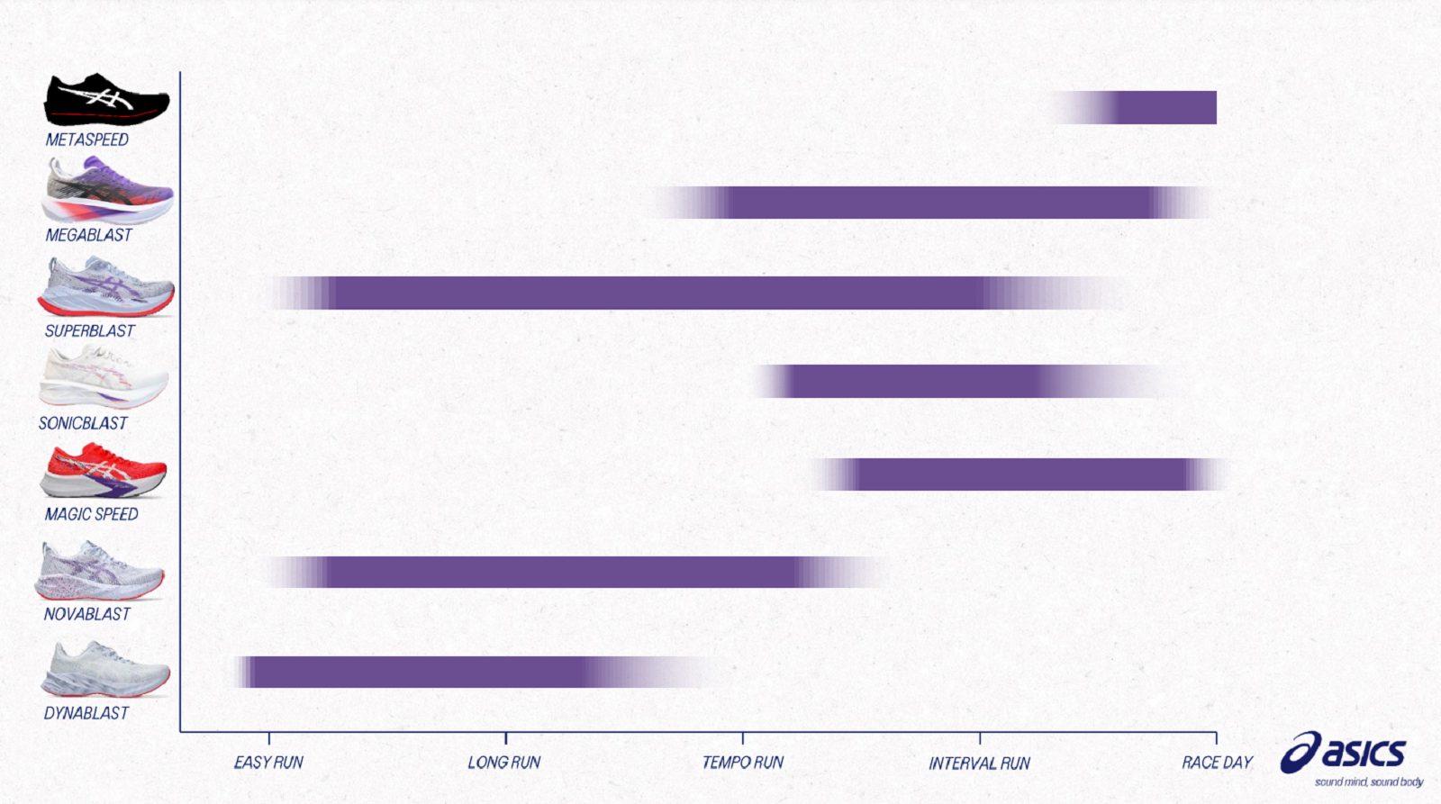 Běžecké vybavení Asics poskytuje svým příznivcům nový přístup k základům běhání. Asics Gel je odpružení tlumící otřesy vznikající při běhu. Inovativní řada Asics Natural Running přináší návrat k přirozenému, minimalistickému běhu.