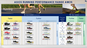 Běžecké vybavení Asics poskytuje svým příznivcům nový přístup k základům běhání. Asics Gel je odpružení tlumící otřesy vznikající při běhu. Inovativní řada Asics Natural Running přináší návrat k přirozenému, minimalistickému běhu.