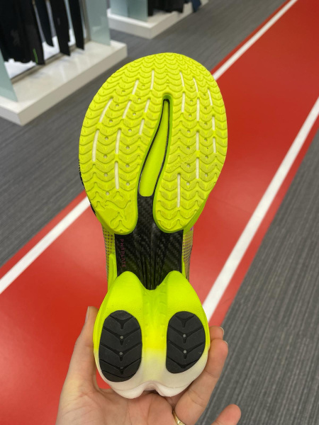 Designově to jsou velmi zajímavé boty. Podrážku tvoří dva oddělené bloky dusíkově boostované pěny Nitro Elite, které jsou propojené karbonový plátem. Ten přesahuje i přes špičku, což je prvek, který jsme u závodních bot ještě neviděli. Mimo jiné je tam proto, aby se energie z došlapu dala lépe využít při odrazu a aby karbonový plát fungoval jako páka, která vás pohání dopředu. Na první pohled to může být trochu nepřirozené, ale odrazová část se vám díky němu prodlouží a získáte tak ze špičky lepší odraz.