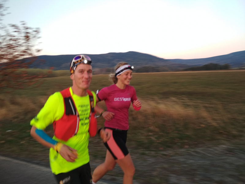 Stále kupředu. Super je, že dokážeme běžet i do kopce. Rozjíždíme indiánský běh. Od patníku k patníku střídáme běh s chůzí. Mára se mě snaží někdy ošidit a protahovat, ale nene, toto mám pod kontrolou. Předbíháme. Je úžasné, že od začátku běhu pořád někoho předbíháme. V průběhu padá tma, a tak se nám obzory zužují na kužely čelovek. Stoupáme, střídají se zatáčky a už kňourám, prosím o trochu terénu, je to nekonečné. Stále jsme všichni v týmu v dobré náladě. Vím, že sem tam povídám, odpovídám, ale co? Nepamatuji si.