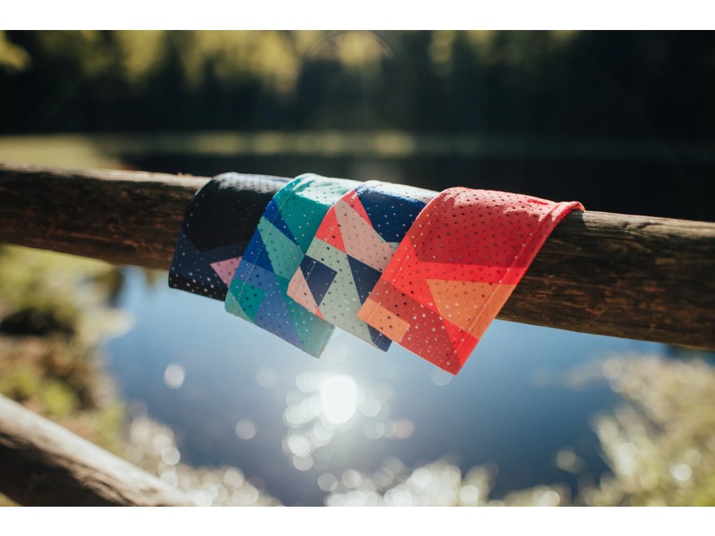 Geo rosy - Neotřelé spojení modrošedé, korálové a vínové v podobě překrývajících se trojúhelníků dělá z této letní čelenky jasnou volbu pro běžkyně, které se nebojí originality a rády vyčnívají z davu. Díky spojení dvou kontrastních barevných škál ti zjednoduší rozhodování, když nevíš, jestli je dnes čas na tlumený nebo odvázaný vzhled.