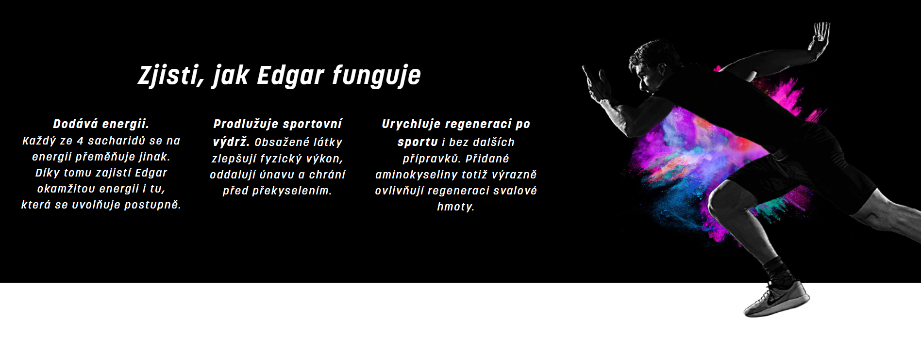 Čím delší výdrž, tím lepší výsledky. Obyčejné nakopáváky založené na taurinu, kofeinu nebo podobných látkách ti sice dopřejí solidní rozjezd, ale za půl hodiny už o nich nevíš. Edgara jsme vyvinuli tak, aby se z něj energie uvolňovala postupně. Edgar tak výrazně prodlužuje dobu, po kterou vydržíš makat naplno.