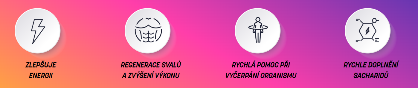 Rychle doplní glukózu a sacharózu, které je potřeba po výkonu doplnit. Používám po náročném tréninku, aby se svaly stihly zotavit. Taky mi pomůže před „mlsnou“ a hladem.