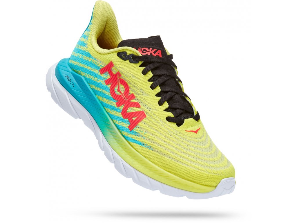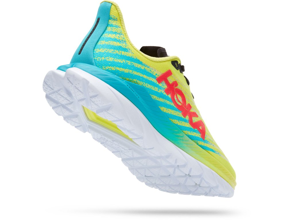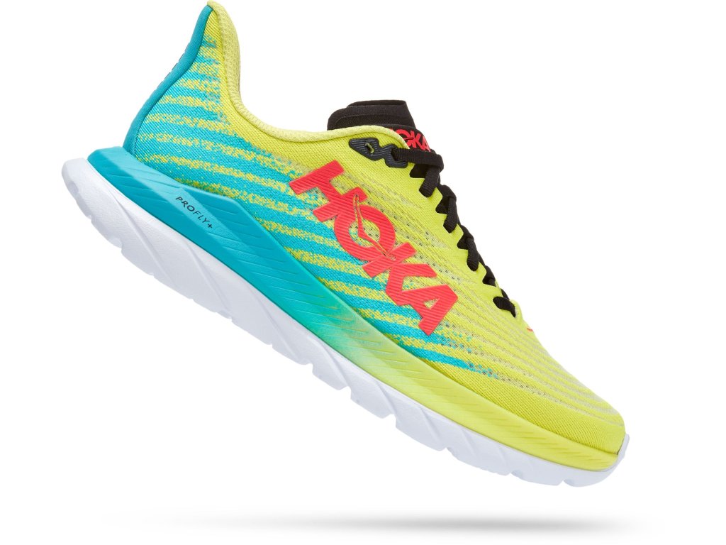 V pořadí pátá verze tempových bot Mach inspirovaná úspěšnými závodními modely Rocket X a Carbon X. Hoka Mach 5 jsou responzivní, lehké a dynamické při každém kroku. Silniční tempové boty byly přepracovány na novou, lehkou a pružnou pěnovou podešev pro dlouhotrvající pohodlí a ochranu při dopadu. Při běhu poskytují pro značku Hoka typickou kombinaci dynamičnosti a vysoké energetické návratnosti. Oproti předchozí generaci jsou Mach 5 o poznání měkčí a pocitově živější. Límec byl u nové verze zvýšen, což usnadňuje nazouvání i zouvání. Celá patní konstrukce je kromě toho navržena tak, aby se minimalizoval tlak vyvíjený při běhu na achilovku. Mach 5 je speciálně navržený pro silniční závody, poskytuje optimální podporu a jistotu, kamkoli tě tvůj běh zavede.