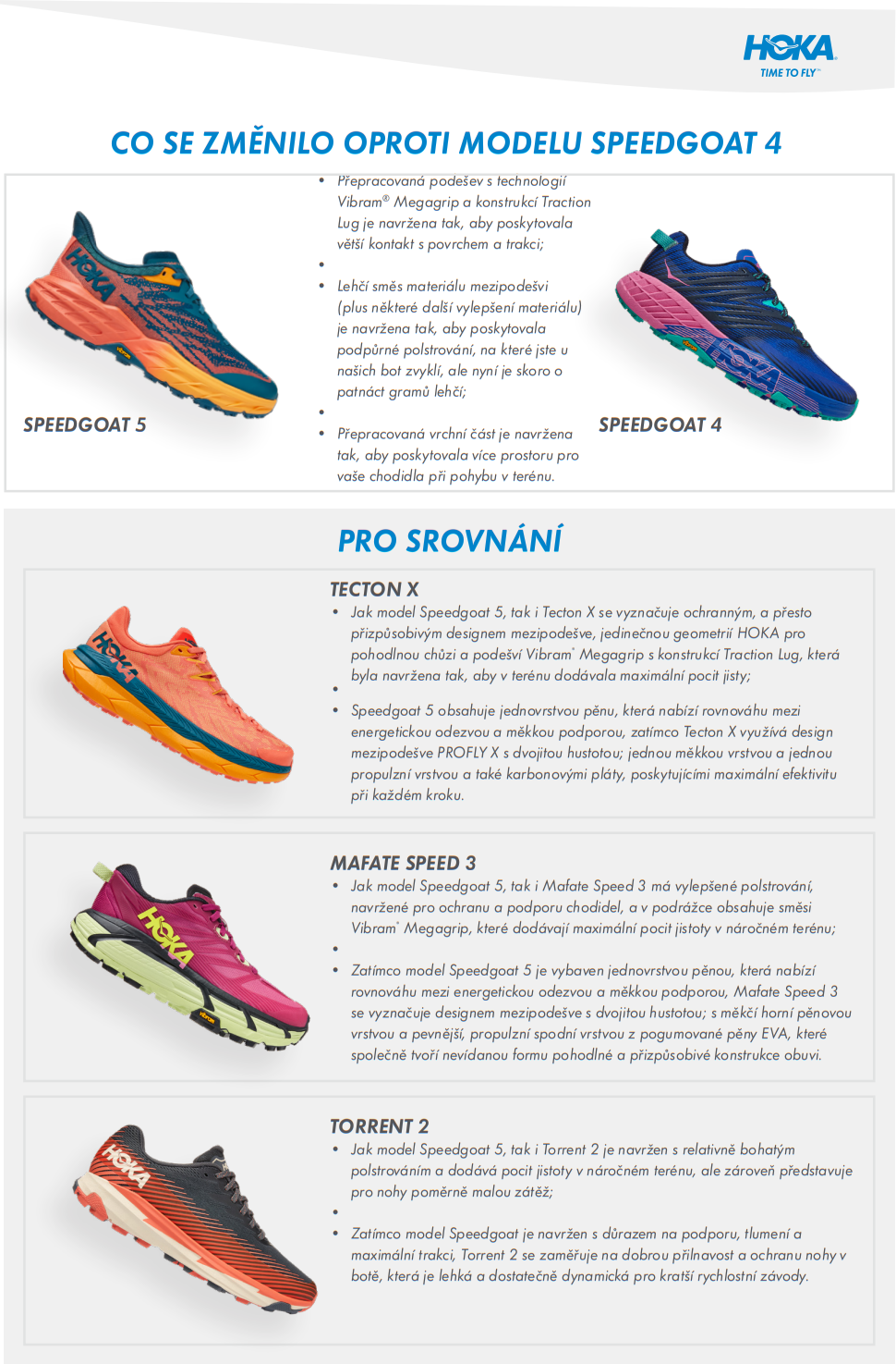 Model Speedgoat 5 byl navržený do technicky náročnějšího terénu. Pátá generace má o 15 gramů méně, ale přichází s lepší a větší trakcí než kdy dřív. Tato zbrusu nová bota je vylepšena o technologii Vibram® Megagrip s trakčním výstupkem pro lepší přilnavost a brzdnou sílu na kypré půdě. Speedgoat 5 si zachovává stejnou výšku podrážky, tvar kolébky, využívá lehčí směs materiálu mezipodešve a silnější, dvouvrstvou žakárovou síťovinu, díky čemuž dodává běžci pocit jistoty v jakémkoli terénu.