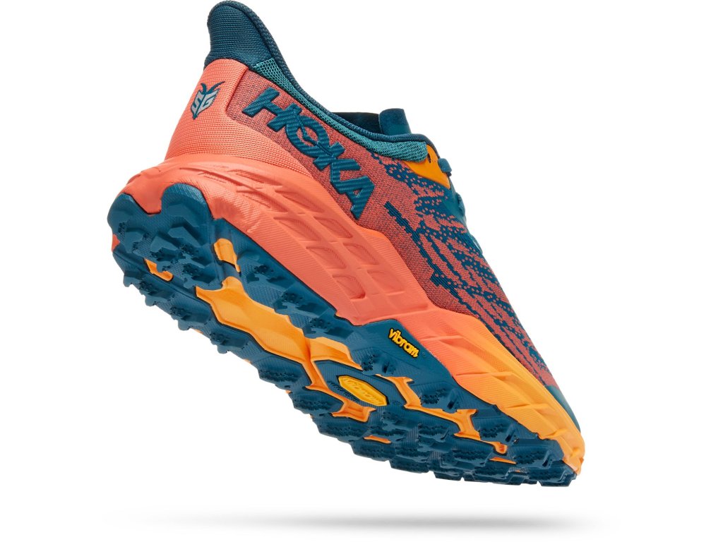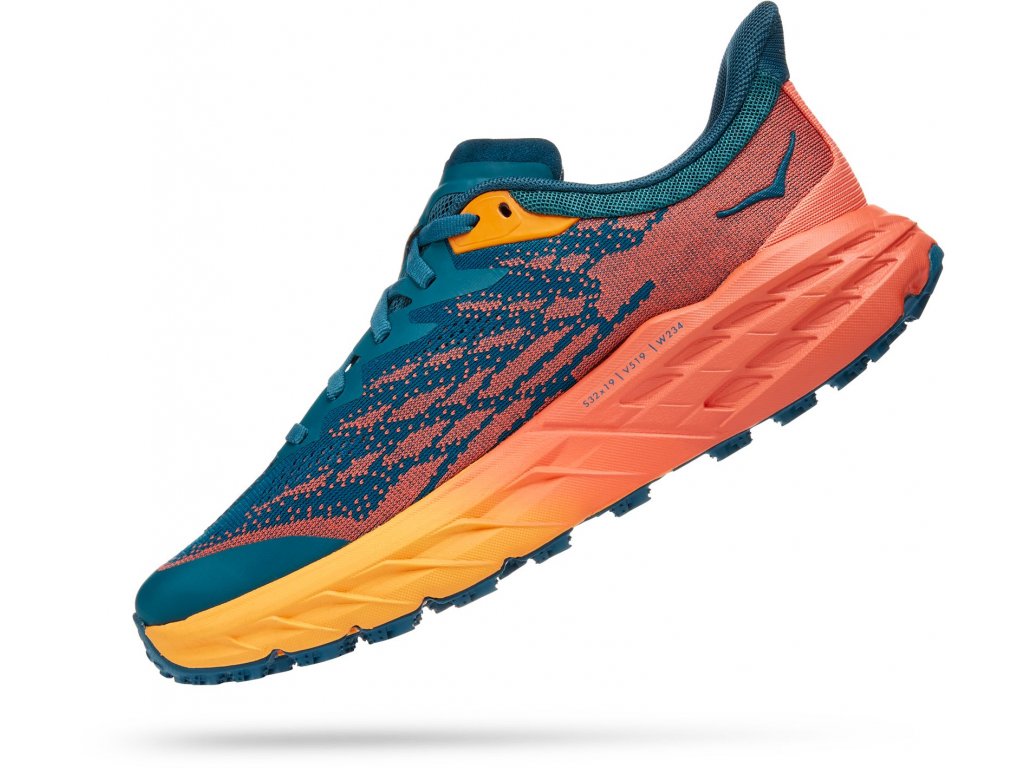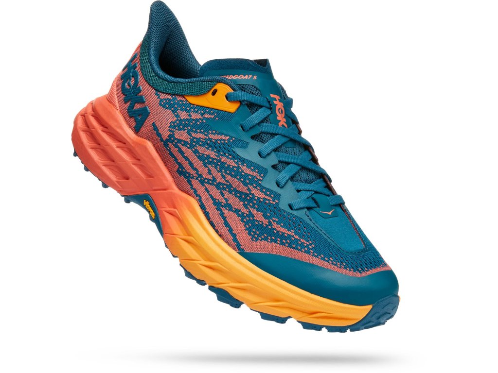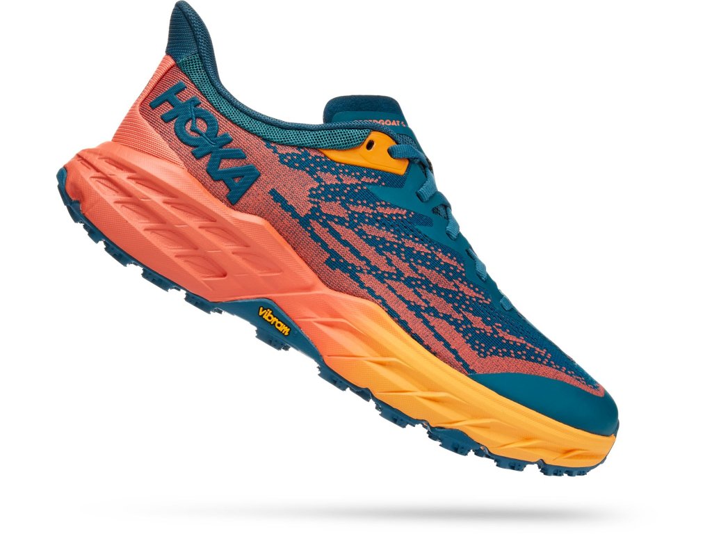 Model Speedgoat 5 byl navržený do technicky náročnějšího terénu. Toto je široká verze WIDE. Pátá generace má o 15 gramů méně, ale přichází s lepší a větší trakcí než kdy dřív. Tato zbrusu nová bota je vylepšena o technologii Vibram® Megagrip s trakčním výstupkem pro lepší přilnavost a brzdnou sílu na kypré půdě. Speedgoat 5 si zachovává stejnou výšku podrážky, tvar kolébky, využívá lehčí směs materiálu mezipodešve a silnější, dvouvrstvou žakárovou síťovinu, díky čemuž dodává běžci pocit jistoty v jakémkoli terénu.