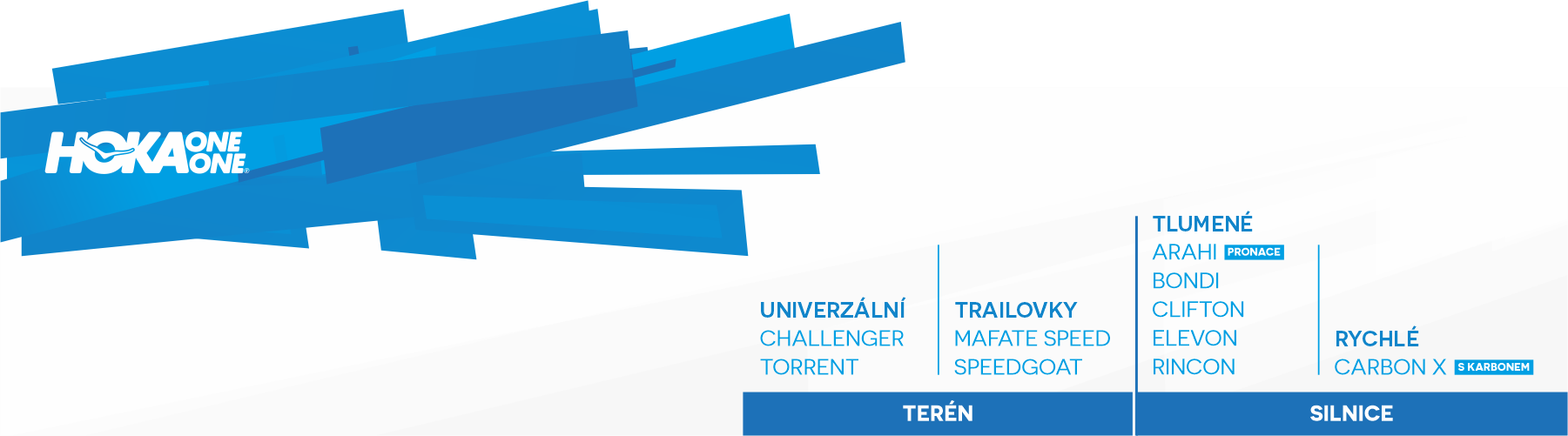 Prémiově tlumené boty, které jsou tak lehké, že je v ruce skoro necítíte? To je Hoka. Do prosince 2021 plným názvem Hoka One One, nyní už jen Hoka. Francouzská značka, která si zakládá na pohodlí, ale nedá si nic ubrat ze své rychlosti. Hoka je tu pro ty, kdo chtějí vyzkoušet úplně jiné běžecké boty. Jejich model Clifton patří k vysoce tlumeným botám na dlouhé maratony, Arahi pomáhá pronačním běžcům, Cielo X a Rocket X jsou závodní pecky s nízkou váhou a opravdu rychlým DNA. Trailovky Challenger ATR a Speedgoat mají své místo na každém velkém horském závodě. A nejtlumenější silničky? Bondi a pronační verze Gaviota.