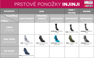 Zákazníci jsou nadšení z komfortu prstových ponožek Injinji, které jsou se dělají v několika variantách tloušťky (weight) a v různých výškách, tak aby sedli vašim osobním preferencím. Pokud jdete po lehčích a vzdušnějších ponožkách zvolte variantu Lightweight. Nejtlustší ponožky jsou vedeny jako Midweight. Pokud preferujete nižší ponožky tak, Injinji Hidden sock jsou kompletně schované ve vaší botě, No-Show jsou v některých botách lehce viditelné. Pokud preferujete ponožky s větším pokrytím kotníku vyzkoušejte Mini-Crew, Crew, Over The Calf ponožky.