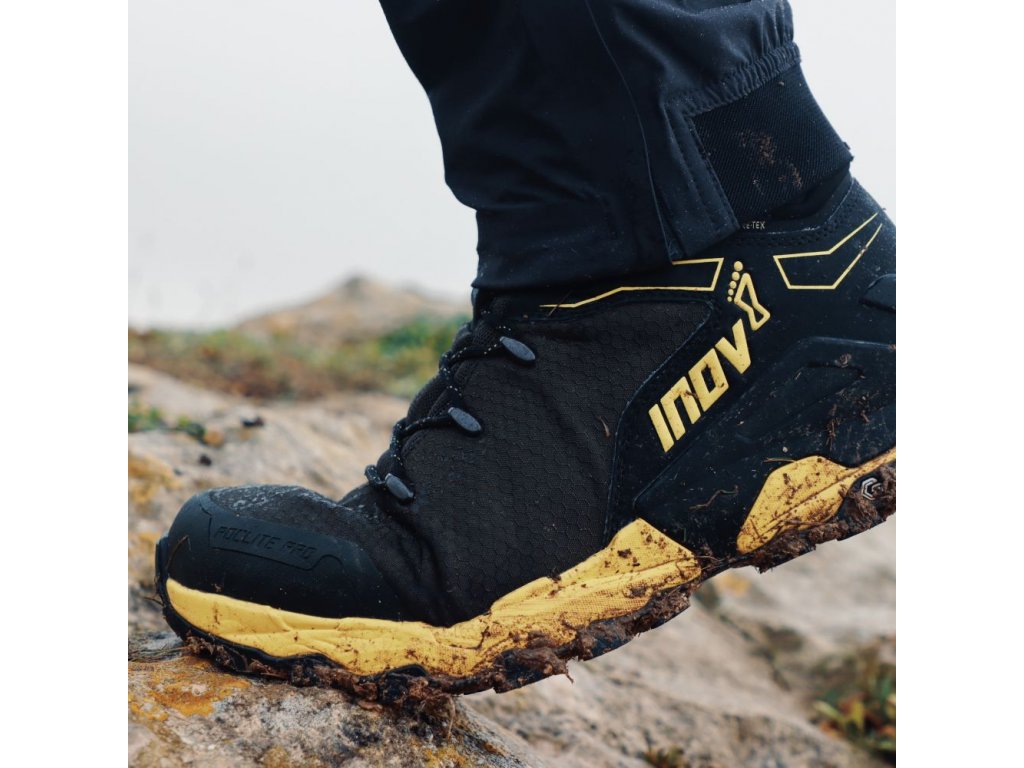 Pánské kotníkové trekové boty Inov-8 Roclite Pro G 400 GTX v2 se středním tlumením a nepromokavou membránou Gore-tex ®. Mezipodešev poskytuje výborný komfort a energetickou návratnost a karbonová výztuha zajišťuje ochranu před ostrými kameny. Skvělé do bahna, na sníh i na šutry, ale perfektně zvládne i tvrdý terén. Podešev s příměsí grafenu zvyšuje odolnost a zároveň spolehlivě podrží na všech typech povrchů. Univerzální boty Inov-8 Roclite Pro G 400 GTX  mají odolný, nenasákavý a široký svršek pro přirozenou práci chodidla i při celodenní túře. Vysoký střih s pohorkovým úvazem pro bezpečné stažení kotníku.