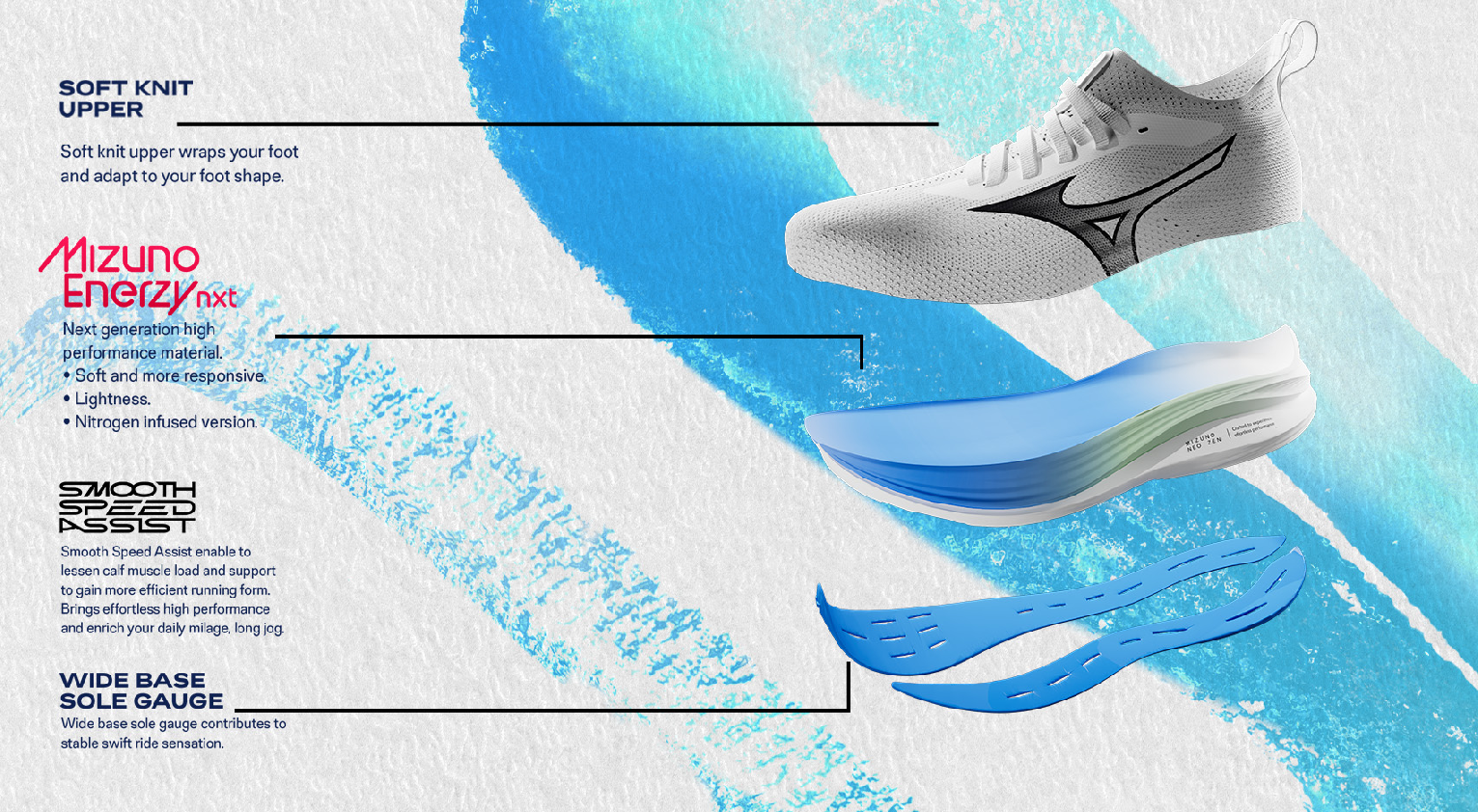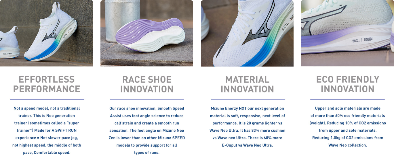 Zkušení běžci s velkou rotací bot pro své obvyklé běhy si tuto botu optimalizovanou pro pocit běhu bez námahy zamilují. Technologie SMOOTH SPEED ASSIST byla vyvinuta pro závodní boty a pomůže vám docílit ideální běžecké formy pro maximální efektivitu. MIZUNO ENERZY NXT (VERZE S DUSÍKEM) je špičkový materiál Mizuno, který poskytuje vynikající měkkost a využití energie při nízké hmotnosti.