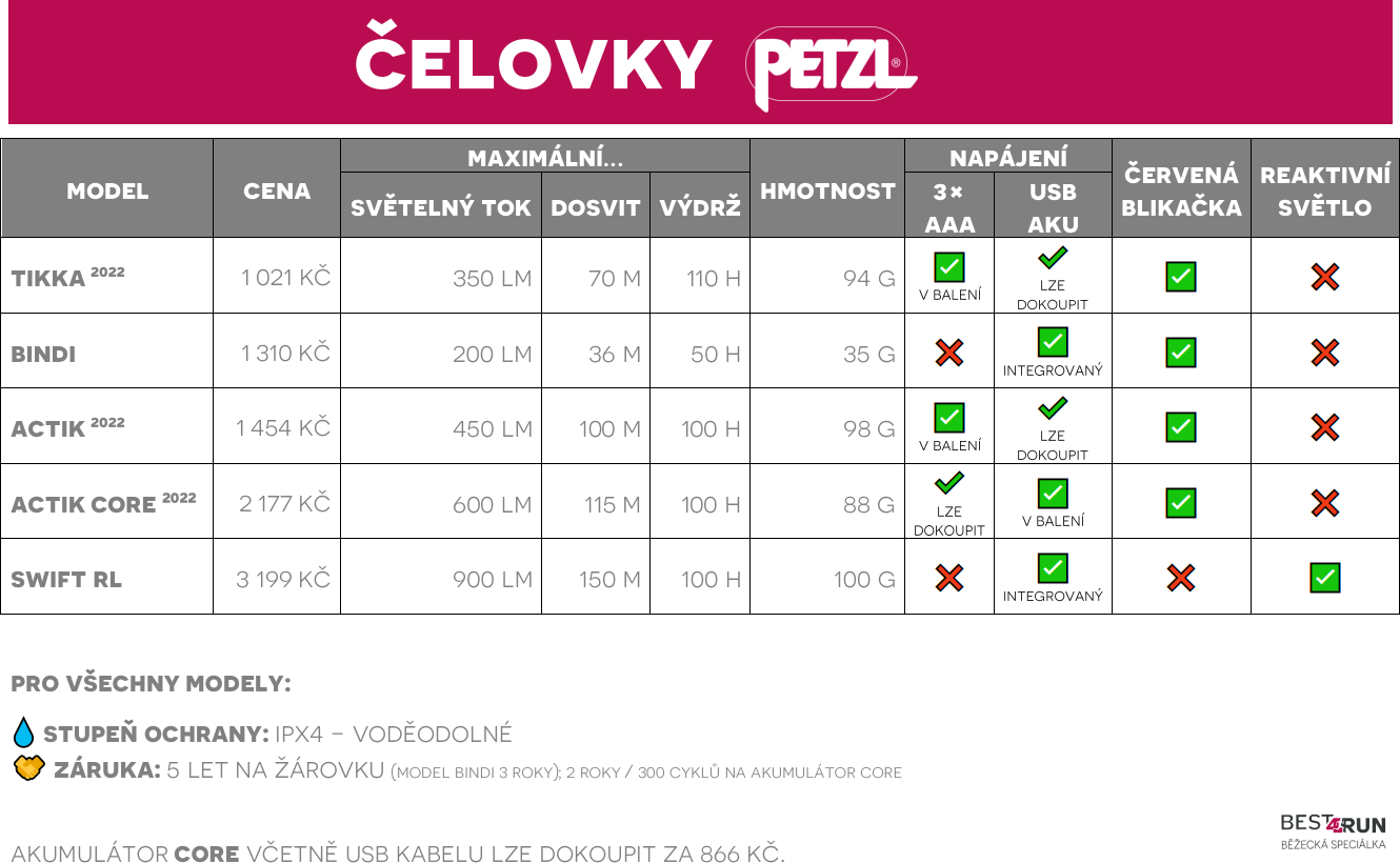 Čelovky Petzl patří k tomu nejlepšímu, co jsme v oboru běžeckých svítilen našli. Rodinný podnik Fernarda Petzla, zapáleného jeskyňáře, vyrábí čelovky už od roku 1970. Čelovky s akumulátorem, bluetooth, reaktivním svícením a dlouhou výdrží patří k celoroční výpravě každého běžce (a nejen jeho).