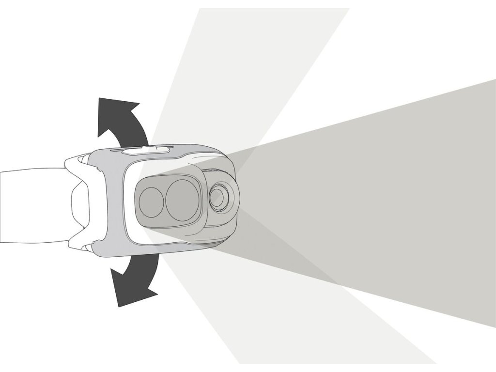 - Tělo svítilny lze naklápět nahoru, abyste viděli dopředu, když ji nosíte na krku, nebo dolů, když ji nosíte na přilbě