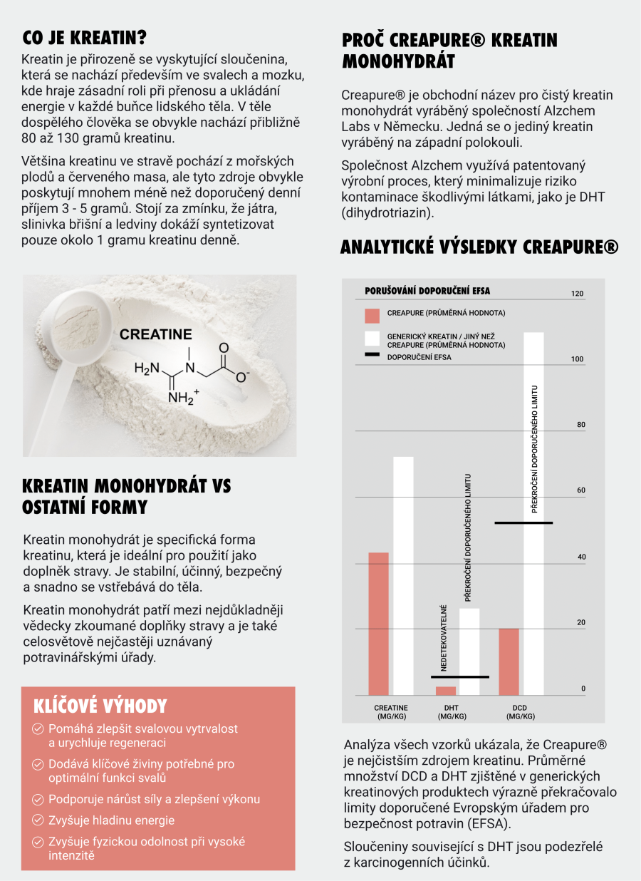 CREATINE MONOHYDRATE obsahuje Creapure® z Německa, nejčistší dostupnou formu kreatin monohydrátu, která je považována za zlatý standard kreatinu. Kreatin je v současné době široce používán ke zvýšení síly a výkonu a podpoře regenerace. Má také pozitivní účinky na kognitivní funkce, jako je zlepšení paměti a snížení duševní únavy.