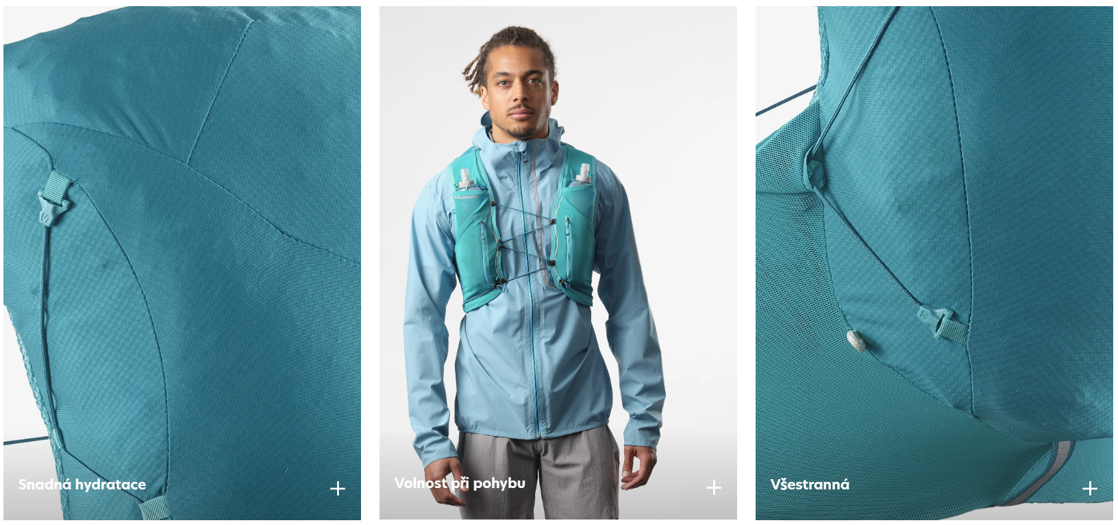 - KAPSY A PŘIHRÁDKY - 2 přední kapsy na láhve: Tyto přední kapsy určené pro pružné lahve Salomon omezují nárazy. Vrchní elastická poutka zabezpečují lahve, které jsou připravené k použití.